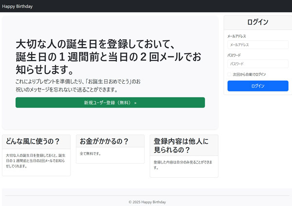 機能:誕生日の1週間前と当日の2回、メールで自動通知